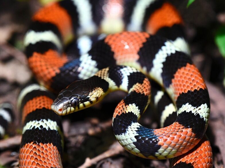 A Coral-Verdadeira (Micrurus) tem um dos venenos mais potentes do Brasil, neurotóxico, que causa paralisia respiratória. Mas a evolução criou a Falsa-Coral (Erythrolamprus), que não tem veneno letal, mas copia as cores da prima perigosa para afugentar predadores. Isso chama-se Mimetismo Batesiano.